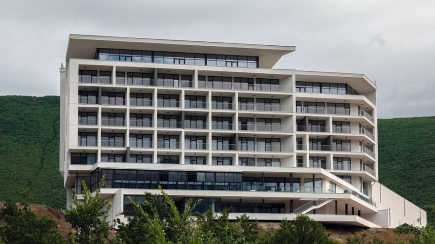 Orijentacija zgrade doprinosi zadivljujućem pogledu na sobe. Prave linije strukture su u skladu sa vizijom jednostavnosti. Konstrukcija koja nije nametnuta već koegzistira sa scenografijom. Dominantna bijela boja koja se koristi za fasadu donosi osjećaj čistoće.