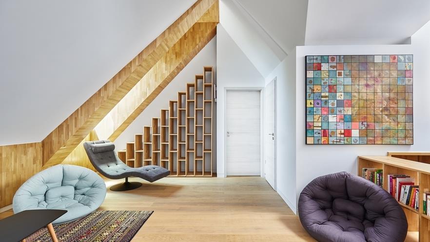 Moving into the interior of the house, visitors meet familiar features that they have met on the exterior. The minimal character of the building remains, while the color contrasts are combined effortlessly in an unexpected way, with the earthly tones that by default bring calmness during the day.