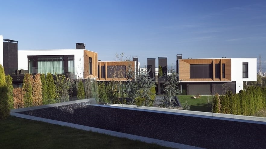 Gli elementi moderni sono evidenti in ogni spazio e si estendono dagli interni agli esterni. Ogni villa ha un proprio cortile che crea un senso di equilibrio e rafforza la continuità con l'ambiente esterno. Le ampie aperture delle finestre, supportate da sistemi in alluminio di alta qualità, minimali e robusti, e le facciate continue ad alta efficienza energetica aumentano notevolmente l'illuminazione naturale.