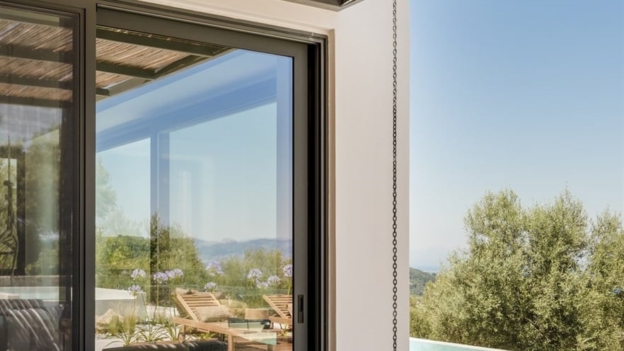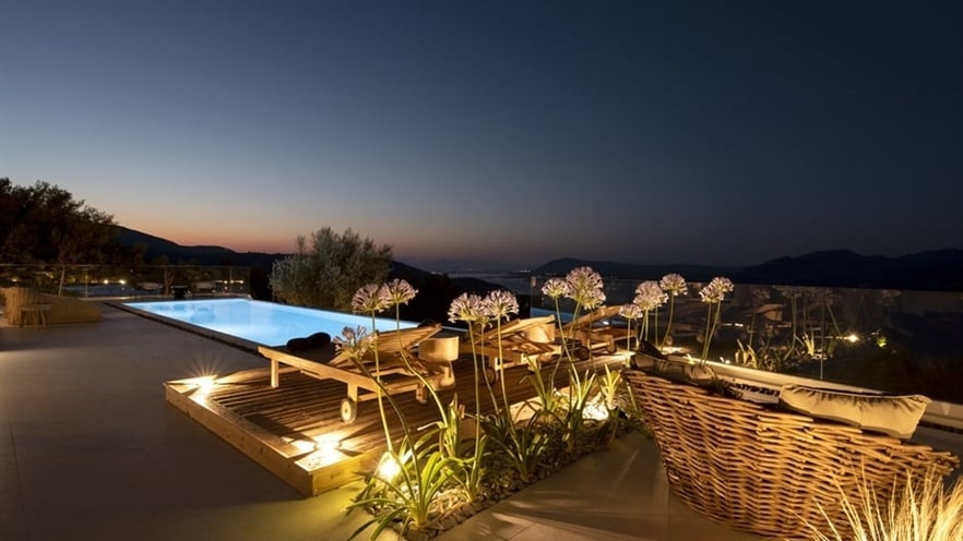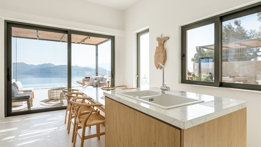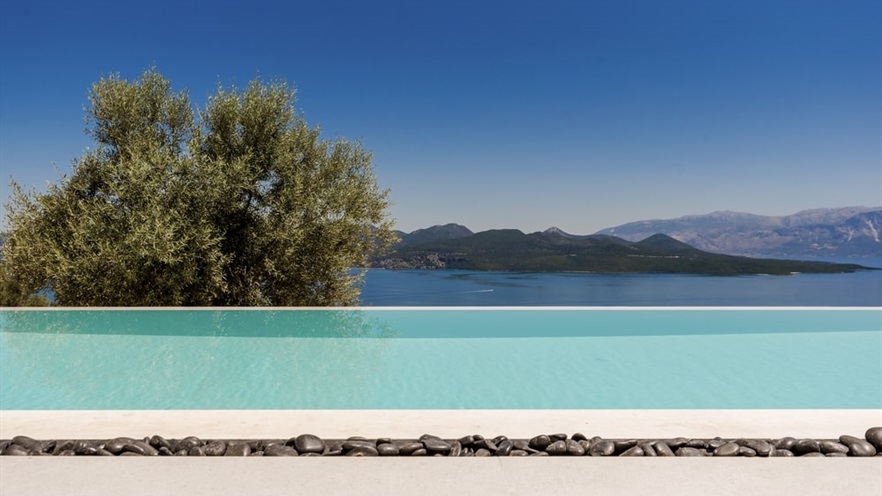 Clădirea este structurată pe trei niveluri și poate fi folosită ca și casă de vacanță în lunile de vară. Parterul găzduiește zona de living, inclusiv bucătăria și salonul, precum și un dormitor. Celelalte două dormitoare sunt amplasate la primul etaj, în timp ce demisolul găzduiește o mică sală de sport cu zonă de wellness, dotată cu o baie de aburi. Culoarea albă a pereților este combinată cu materiale naturale, cum ar fi lemn, bambus, trestie și paie țesute în toate elementele de mobilier și decorative. Lumina naturală domină în interior, deoarece deschiderile ample oferă unificare totală cu mediul exterior. În același timp, ferestrele permit o vedere neobstrucționată asupra Mării Ionice. Zonele exterioare sunt modelate în același mod; aici, spațiul este organizat în zone distincte cu saloane în aer liber pe mai multe niveluri, urmărind terenul și păstrând contactul cu elementele de apă și peisajul.